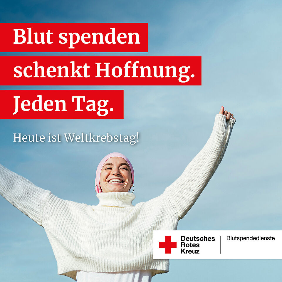 Anlässlich des Weltkrebstages am 4. Februar weisen die Blutspendedienste des Deutschen Roten Kreuzes darauf hin, dass die sichere Versorgung mit therapeutischen Blutkomponenten (Blutkonserven) eine zentrale Rolle bei der Behandlung von Krebspatienten spielt. Rund 20 Prozent aller Blutspenden kommen Krebspatientinnen und -patienten zugute.
