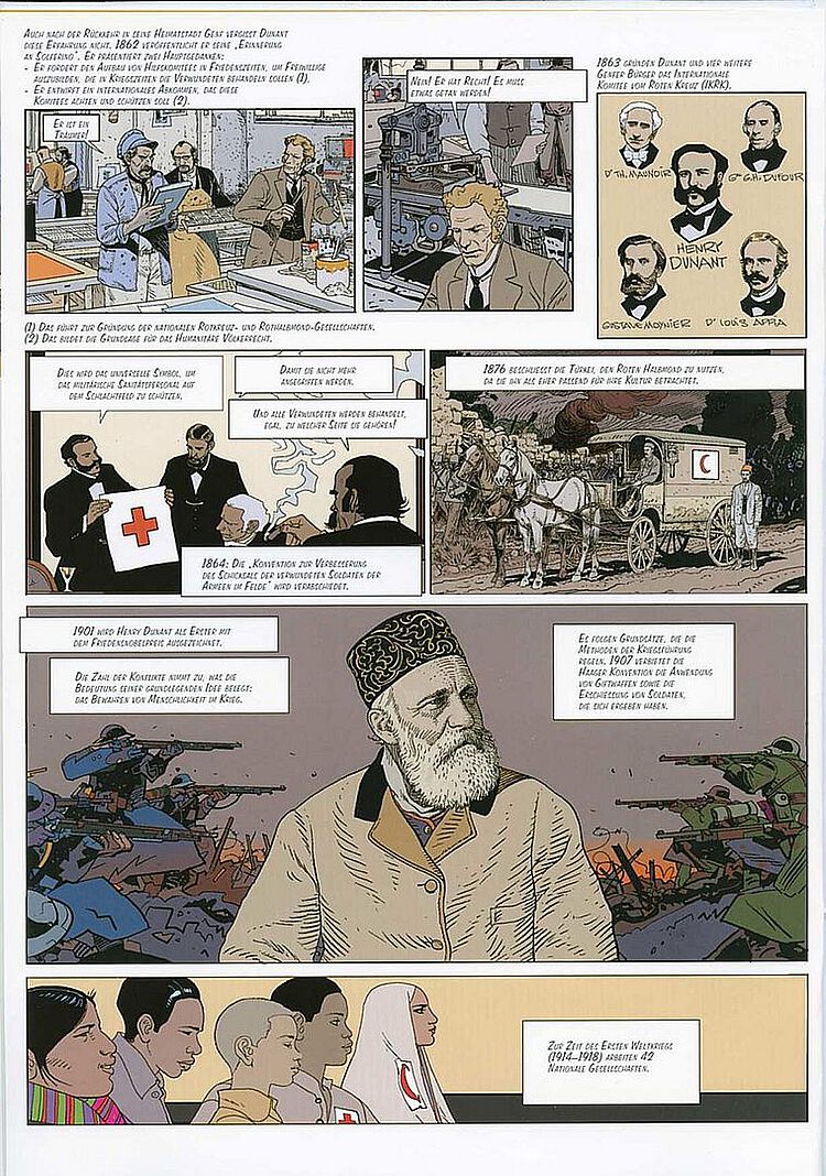 Henry Dunant, ein 31jähriger Geschäftsmann aus Genf, will in Algerien Mühlen bauen. Da ihm aber die Behörden der damaligen französischen Kolonie das Geschäft erschweren, macht er Schulden und steht schließlich kurz vor dem Bankrott. Hilfe erhofft er sich vom Kaiser höchstpersönlich. Napoleon III. befindet sich aber gerade auf einem Feldzug. Er unterstützt in der Lombardei die Italiener im Krieg gegen die Habsburger. Dunant reist ihm hinterher und erreicht am 25. Juni 1859 Castiglione, eine kleine Stadt südlich des Gardasees. Er besichtigt das Schlachtfeld von Solferino und ist zutiefst erschüttert. Bei dem grausamen Gefecht sind 40.000 Menschen niedergemetzelt und verstümmelt worden. Ihre toten Körper liegen jetzt auf Wegen und in Gräben. Verletzte Soldaten "mit offenen Wunden und einsetzendem Wundbrand, sind wie von Sinnen vor Schmerzen, sie bitten flehentlich, dass man sie tötet, und winden sich mit verzerrtem Gesicht im Todeskampf", schreibt Dunant später über die Sterbeszenen, die sich tief in sein Gedächtnis einbrennen. Er eilt den Verwundeten ohne Ausrüstung zu Hilfe; einheimische Helfer bringen sie mit Karren und Wagen in die umliegenden Klöster und Kirchen. Während er unermüdlich versucht, das Leid der Verletzten zu lindern, entdeckt Dunant seine neue Mission: Er möchte das Los der verwundeten Soldaten verbessern und den Krieg menschlicher machen.