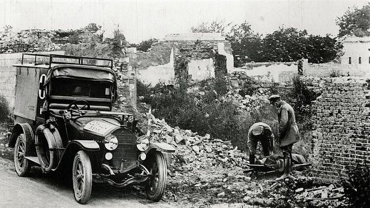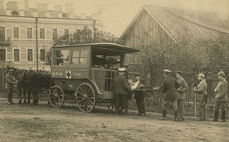 Bereits 1905 entwickelt ein Bonner Karosseriebauer, der bis dahin Pferdekutschen für den Krankentransport hergestellt hat, den ersten automobilen Krankenwagen. Im Ersten Weltkrieg kommen dann in größerem Stil motorisierte Sanitätsfahrzeuge zum Einsatz, zunächst zum Transport verwundeter Soldaten, später auch für Zivilisten. Wobei aus Mangel an Fahrzeugen und Benzin die Hauptarbeit auch weiterhin mit Pferdegespannen bewältigt wird, nicht selten auch mit requirierten Bauernwagen, einfachen Packwagen oder zweirädrigen Karren.