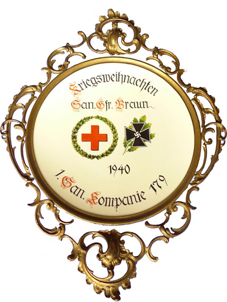 Das Rote Kreuz und die Heeressanitätseinheiten bereiten allerlei Geschenke und Auszeichnungen für das Fest vor. Ob sich der Sanitätsgefreite Braun, Angehöriger der 1. Sanitätskompanie 179 der Wehrmacht, 1940 über diesen barock umrandeten Teller gefreut hat? Er vereint die Symbole seines Wirkungskreises: das Rote Kreuz im Lorbeerkranz, daneben auf Eichenlaub das Eiserne Kreuz mit einem Hakenkreuz im Zentrum.
