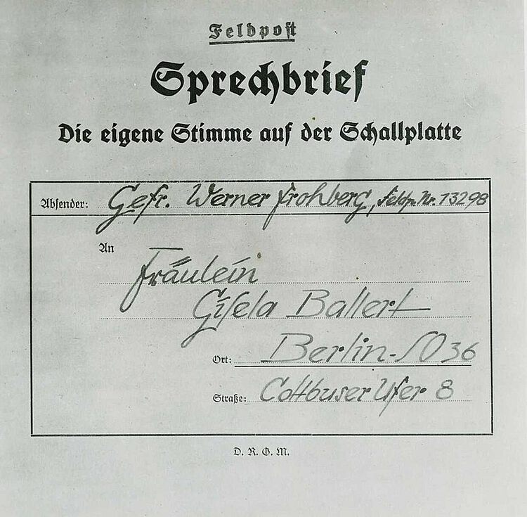 Verwundeten Soldaten, die im Lazarett liegen und nicht mehr schreiben können, gibt das DRK die Möglichkeit, ihre Grüße und ein Lieblingsmusikstück mit dem „sprechenden Feldpostbrief“ in die Heimat zu senden. Die Aufnahme wird von Mitarbeitern des Roten Kreuzes auf robuste Schallfolien geschnitten, die zusammen mit einer speziellen Abspielnadel verschickt werden.