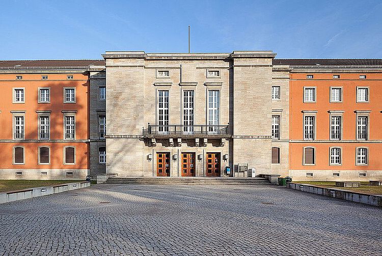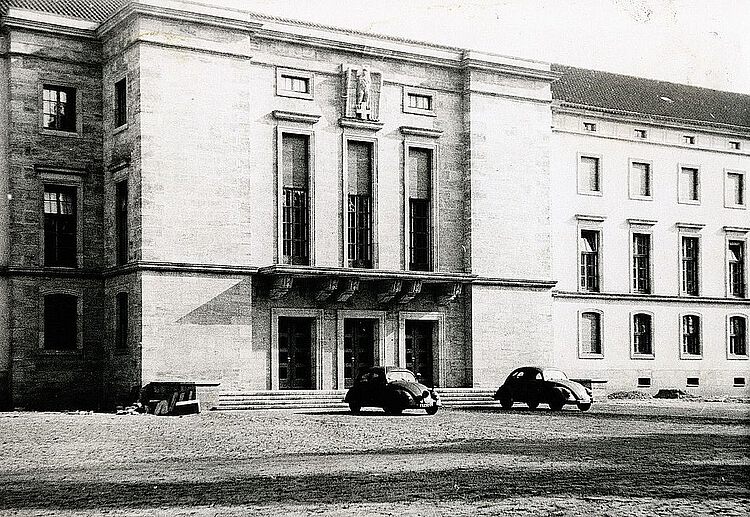 1938 begonnen, kann der Neubau des Präsidiums infolge des Krieges erst 1943 bezogen werden. Das monumentale Gebäude soll, so der Geschäftsführende Präsident Ernst Robert Grawitz, "der großen, stolzen Tradition des DRK sichtbaren Ausdruck verleihen". Ein wuchtiger, zweihundert Meter langer Gebäuderiegel, aber doch im Vergleich zu reinen Propagandabauten nicht übermäßig monumental, eher zweckgerichtet.