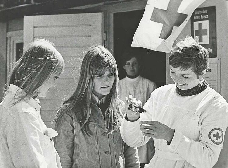 Im Oktober 1952 ist das DRK der DDR gegründet worden. Zwei Jahre später wird es durch das „Internationale Komitee vom Roten Kreuz“ (IKRK) international anerkannt und in die Liga der Rotkreuz-Gesellschaften aufgenommen. Zunächst zeigt die Bevölkerung wenig Interesse an den Aktivitäten des Roten Kreuzes, fehlt es ihr doch an Informationen über die neue Ausrichtung der Organisation. Auf der Gründungsveranstaltung bemerkt ein Handwerker: „Warum 'Deutsches Rotes Kreuz'? Jetzt fangen sie schon wieder an mit dem Mist! ... Na, es wird doch bald wieder knallen.“