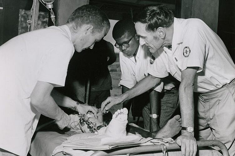 Mehrere Monate lang versuchen die Helfer alles nur Menschenmögliche. Sie leisten Geburtshilfe und heben Gräber aus, sie bergen Kinder aus der Frontlinie und operieren in notdürftig ausgestatteten Hospitälern. „Lange Reihen ausgezehrter, in Lumpen gehüllter, zum Teil auch nackter, bis zum Skelett abgemagerter Menschen“, beschreibt einer von ihnen die Szenerie. „Sie haben Schüsseln, Tücher, Kleiderfetzen oder auch nur Palmblätter in der Hand, um eine Handvoll Reis oder Bohnen zu erhaschen.“