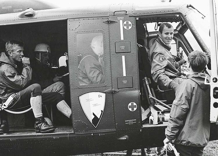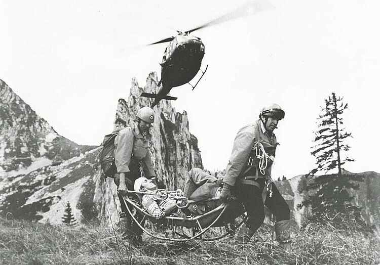 Die ersten Luftrettungsübungen der Bergwacht mit einem Helikopter fanden 1956 am Tegernsee statt. 1975 werden bereits bis zu neunzig Prozent der Schwerverletzten am Berg mit Hubschraubern ins Tal gebracht.
