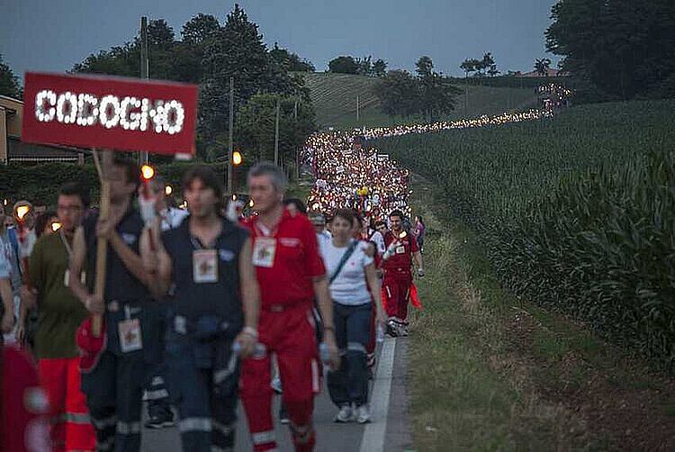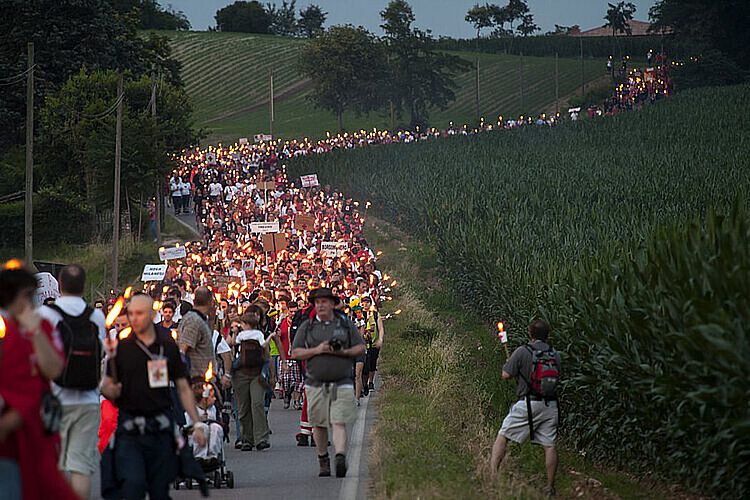 Der Korso beginnt bei Einbruch der Dunkelheit am Burgberg von Solferino. Halb Kundgebung, halb Prozession schiebt er sich durch das Dorf; Hochrufe und Trommeln schallen durch die sonst so stillen Gassen. Rot ist die vorherrschende Farbe, sei es als saloppes T-Shirt, sei es als pflichtbewusste Schutzweste. Überall entlang der Strecke haben sich Zaungäste postiert, um die Lichterketten zu bewundern.